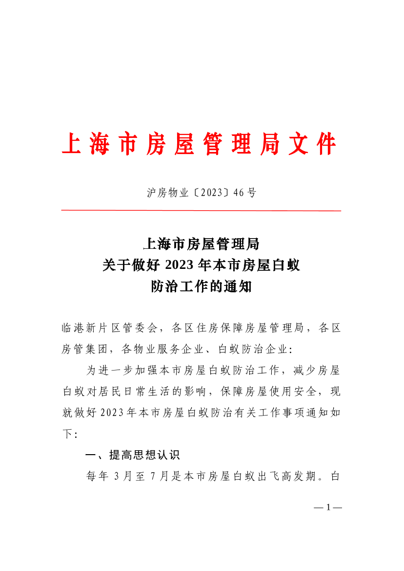 上海市房屋管理局 关于做好2023年本市房屋白蚁防治工作的通知