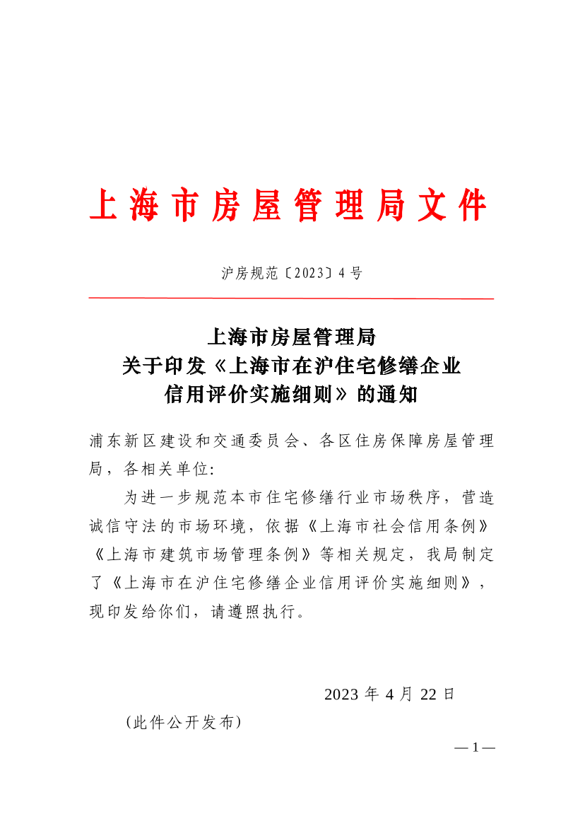 上海市房屋管理局 关于印发《上海市在沪住宅修缮企业信用评价实施细则》的通知