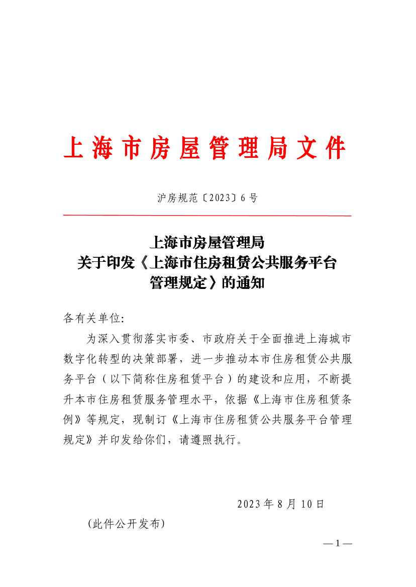 为深入贯彻落实市委、市政府关于全面推进上海城市数字化转型的决策部署,进一步推动本市住房租赁公共服务平台(以下简称住房租赁平台)的建设和应用,不断提升本市住房租赁服务管理水平,依据《上海市住房租赁条例》等规定,现制订《上海市住房租赁公共服务平台管理规定》并印发给你们,请遵照执行。
