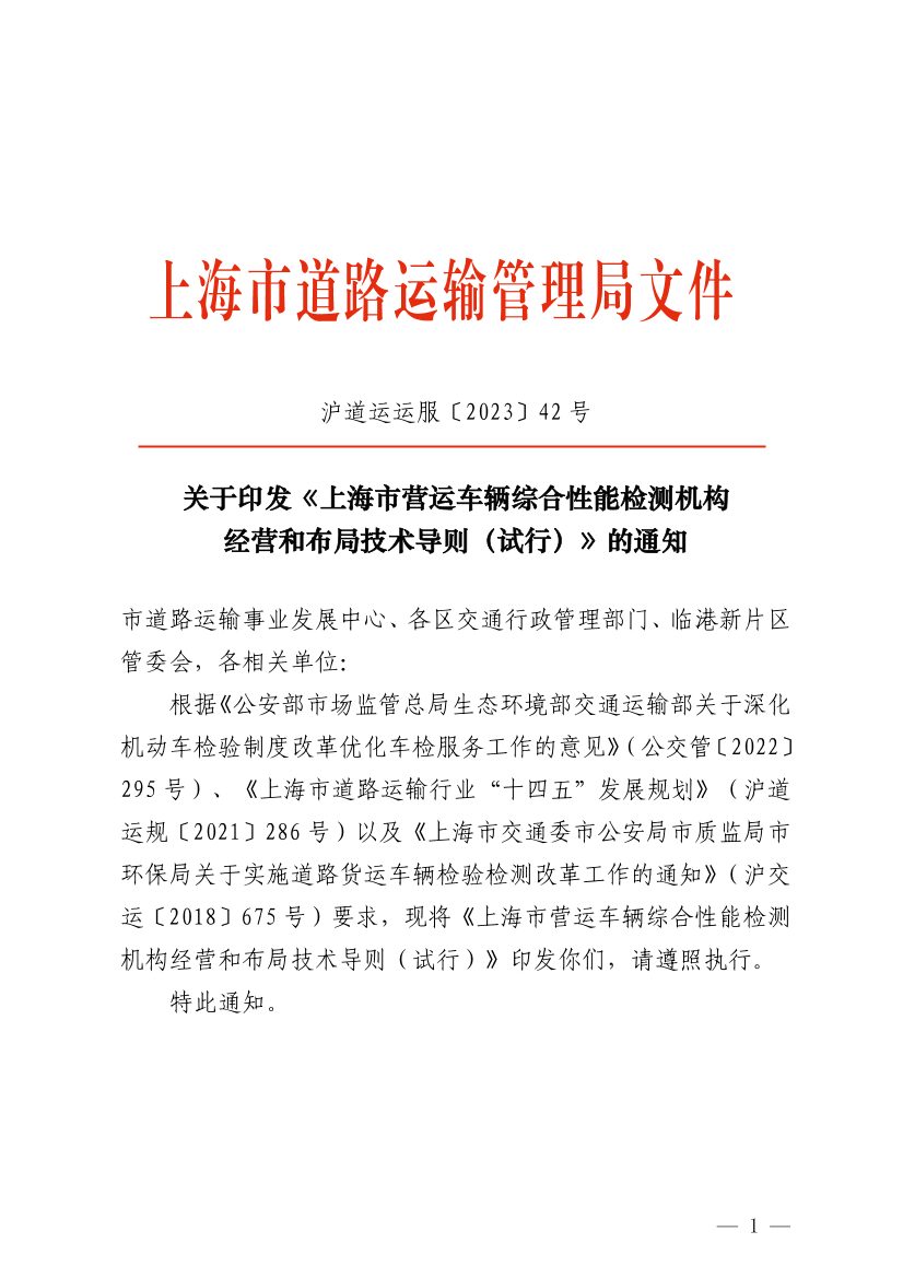 根据《公安部市场监管总局生态环境部交通运输部关于深化机动车检验制度改革优化车检服务工作的意见》(公交管〔2022〕295号)、《上海市道路运输行业“十四五”发展规划》(沪道运规〔2021〕286号)以及《上海市交通委市公安局市质监局市环保局关于实施道路货运车辆检验检测改革工作的通知》(沪交运〔2018〕675号)要求,现将《上海市营运车辆综合性能检测机构经营和布局技术导则(试行)》印发你们,请遵照执行。