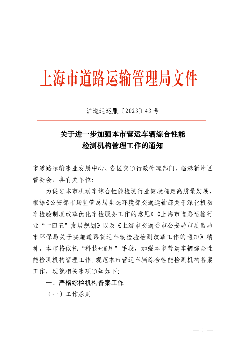 为促进本市机动车综合性能检测行业健康稳定高质量发展,根据《公安部市场监管总局生态环境部交通运输部关于深化机动车检验制度改革优化车检服务工作的意见》《上海市道路运输行业“十四五”发展规划》以及《上海市交通委市公安局市质监局市环保局关于实施道路货运车辆检验检测改革工作的通知》精神,本市将依托“科技+信用”手段,加强本市营运车辆综合性能检测机构管理工作,规范本市营运车辆综合性能检测机构备案工作,现就相关事项通知如下: