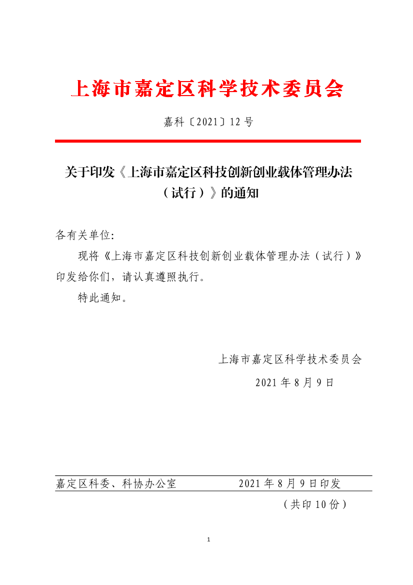 关于印发《上海市嘉定区科技创新创业载体管理办法(试行)》的通知