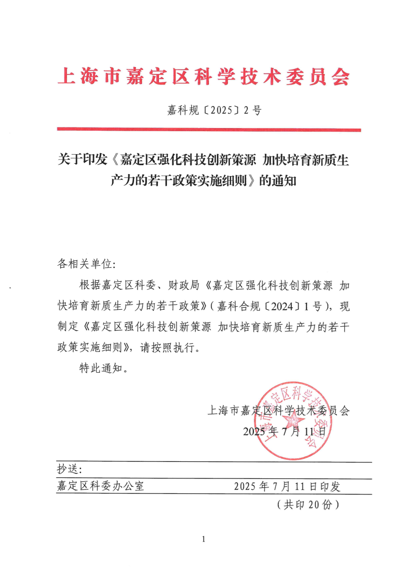 根据嘉定区科委、财政局《嘉定区强化科技创新策源 加快培育新质生产力的若干政策》(嘉科合规〔2024〕1号),现制定《嘉定区强化科技创新策源 加快培育新质生产力的若干政策实施细则》,请按照执行。