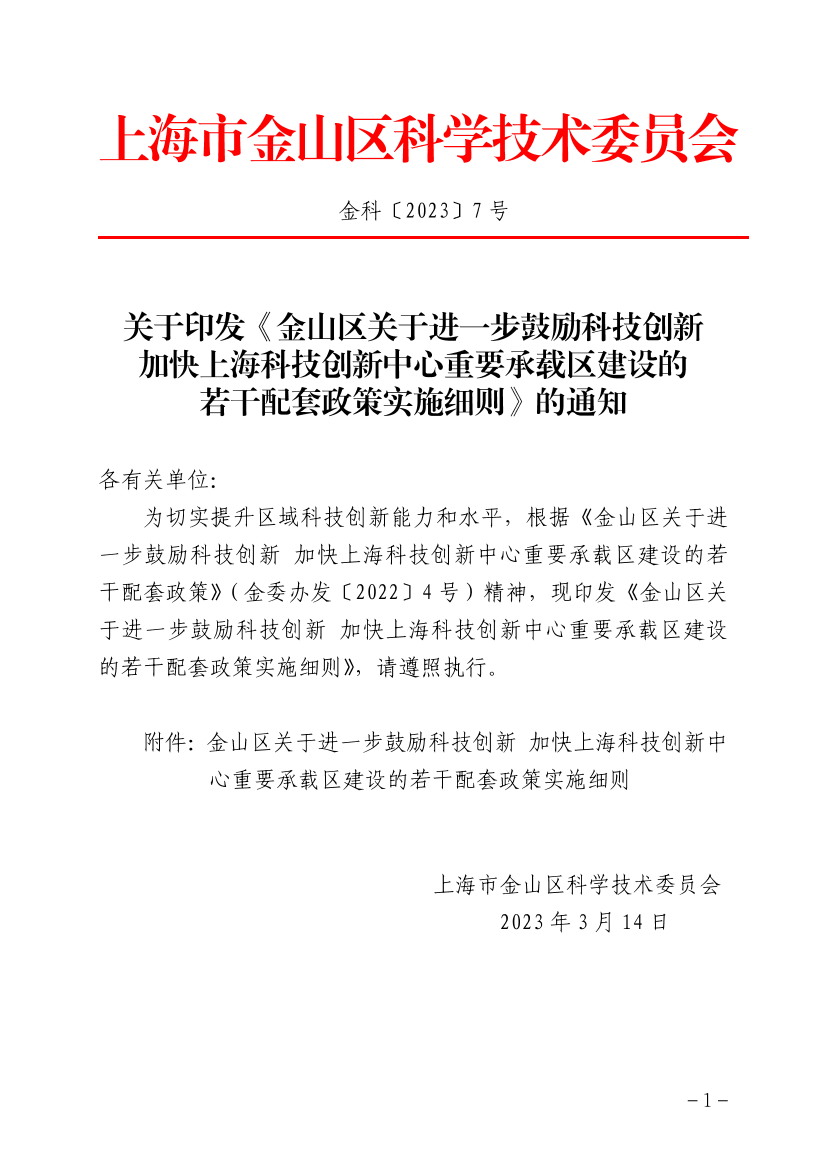 附件:金山区关于进一步鼓励科技创新 加快上海科技创新中心重要承载区建设的若干配套政策实施细则