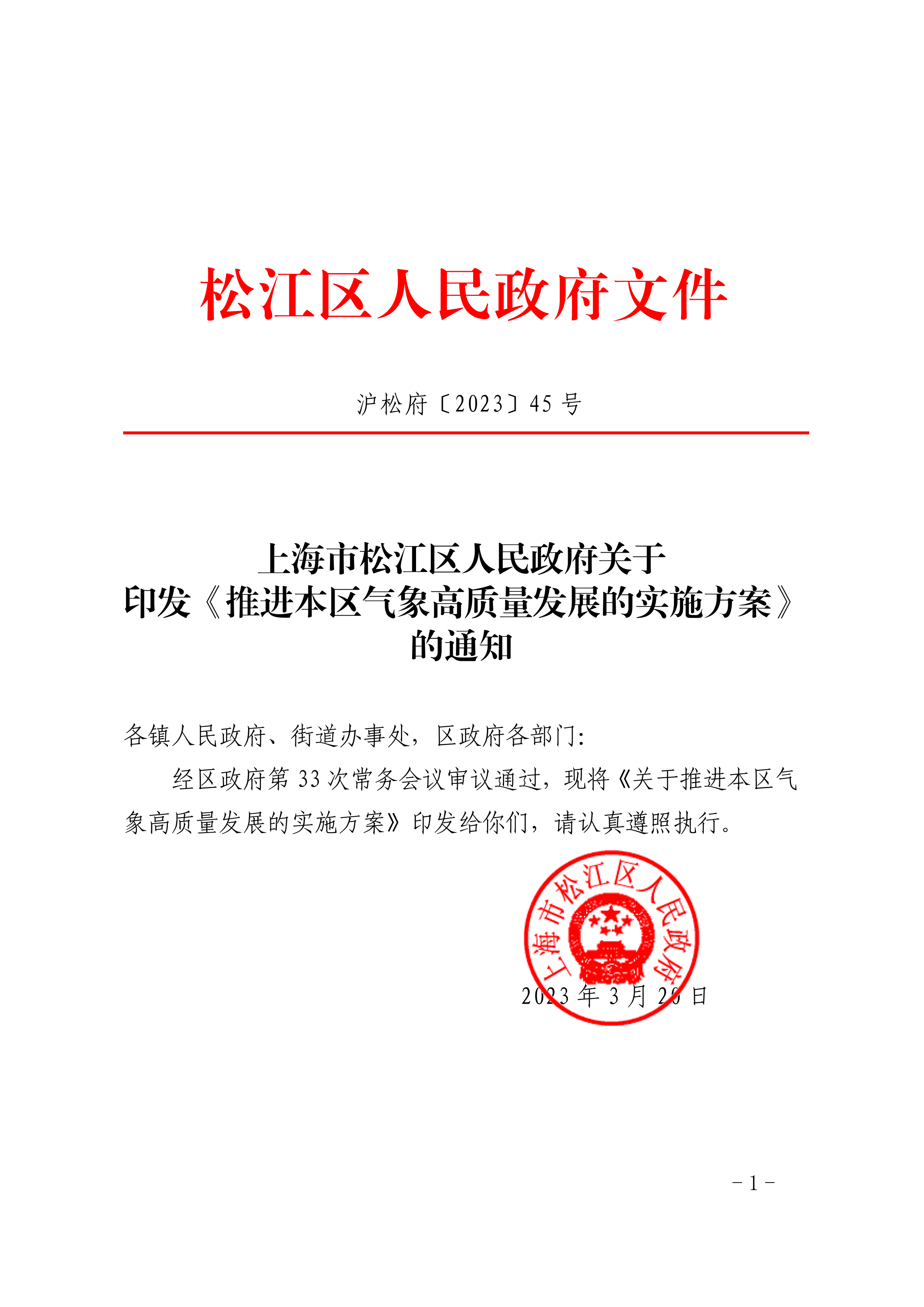 为贯彻落实党中央、国务院决策部署,推进《气象高质量发展纲要(2022-2035年)》(国发〔2022〕11号)有效落实,根据《关于加快推进本市气象高质量发展的意见(2022-2035年)》(沪府发〔2022〕16号),进一步提升松江气象工作促进经济社会发展、保障和改善民生、服务防灾减灾救灾的能力和水平,有力推动气象高质量发展,制定本实施方案。