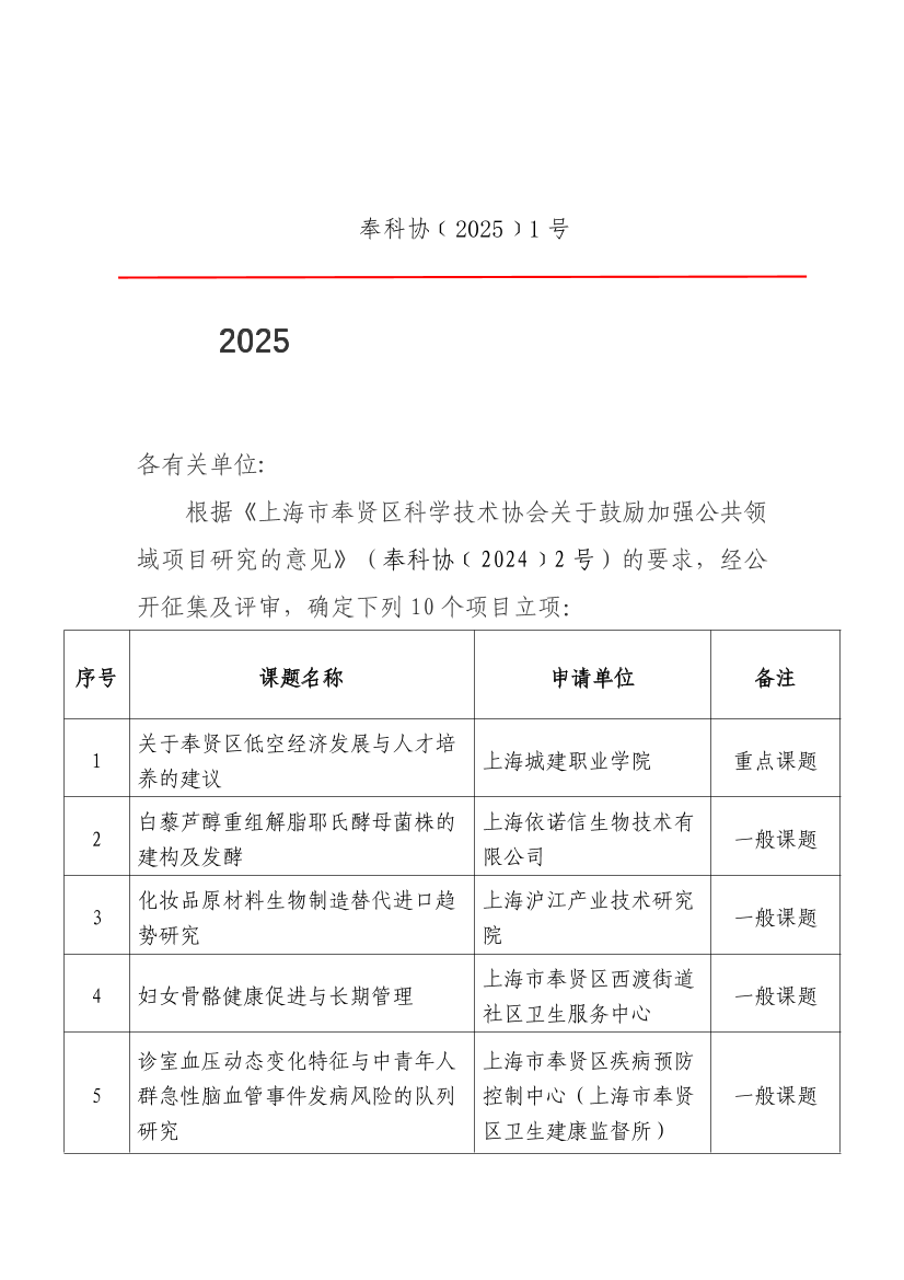 根据《上海市奉贤区科学技术协会关于鼓励加强公共领域项目研究的意见》(奉科协﹝2024﹞2号)的要求,经公开征集及评审,确定下列10个项目立项: