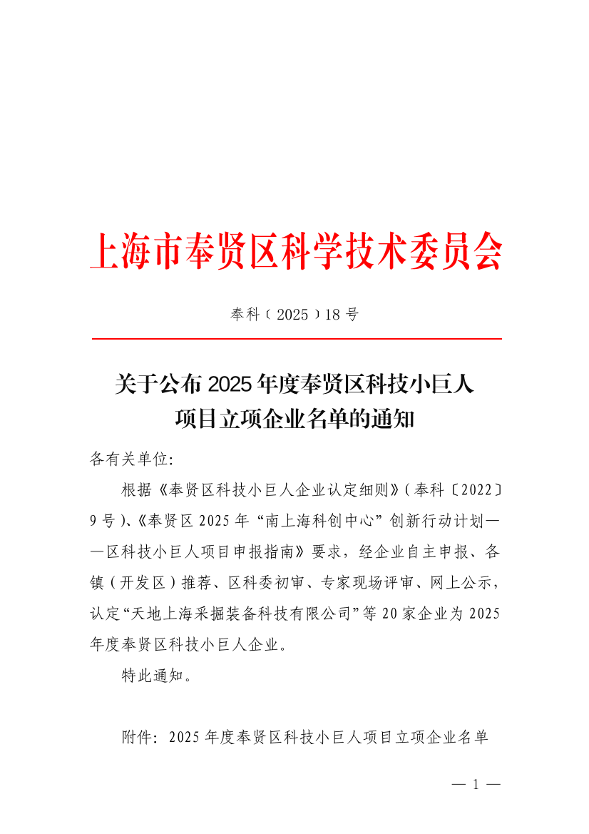 根据《奉贤区科技小巨人企业认定细则》(奉科〔2022〕9号)、《奉贤区2025年“南上海科创中心”创新行动计划——区科技小巨人项目申报指南》要求,经企业自主申报、各镇(开发区)推荐、区科委初审、专家现场评审、网上公示,认定“天地上海采掘装备科技有限公司”等20家企业为2025年度奉贤区科技小巨人企业。