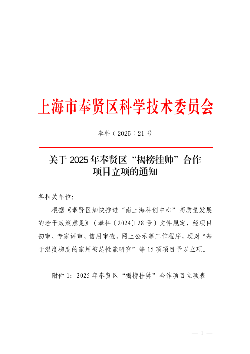 根据《奉贤区加快推进“南上海科创中心”高质量发展的若干政策意见》(奉科〔2024〕28号)文件规定,经项目初审、专家评审、信用审查、网上公示等工作程序,现对“基于温度梯度的家用被芯性能研究”等15项项目予以立项。
