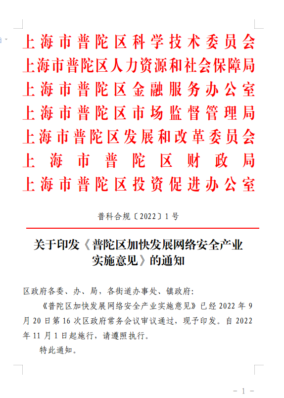 《普陀区加快发展网络安全产业实施意见》已经2022年9月20日第16次区政府常务会议审议通过,现予印发。自2022年11月1日起施行,请遵照执行。