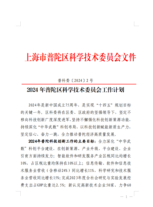 2024年普陀科技创新工作的主要目标:全力深化“中华武数”科创平台建设,在创新策源、产业升级、平台建设、企业引育方面持续发力;智能软件和研发服务产业区税同比均增长10%,占区税比重均保持在10%以上;信息传输、软件和信息技术服务业营收(含移动24%)同比增长11%,科学研究和技术服务业营收同比增长15%;完成2023年度全社会研究与实验发展经费支出占GDP比重达2.5%;新认定高新技术企业50家、力争60家,培育市、区科技小巨人企业20家,支持区“互联网+”企业10家;实现技术合同成交额超110亿元;招商引资企业2024年合计产区税突破1亿元;新增数字化转型示范项目和标杆场景20个,新开通5G室外宏站200个;完成50个住宅小区地下车库移动通信网络覆盖。