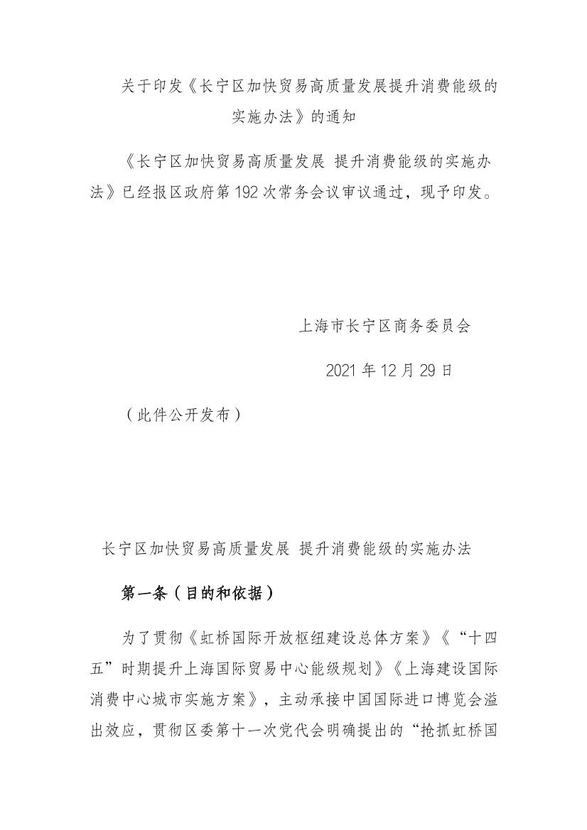《长宁区加快贸易高质量发展提升消费能级的实施办法》已经报区政府第192次常务会议审议通过,现予印发。