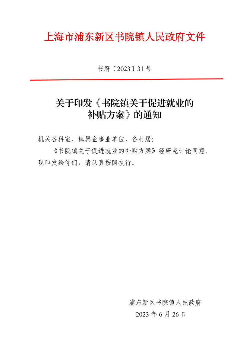 关于印发《书院镇关于促进就业的补贴方案》的通知