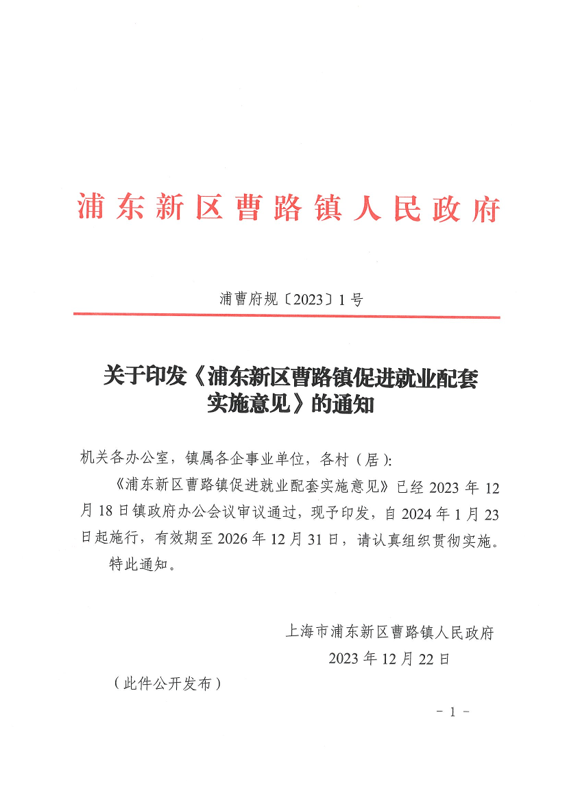 关于印发《浦东新区曹路镇促进就业配套实施意见》的通知
