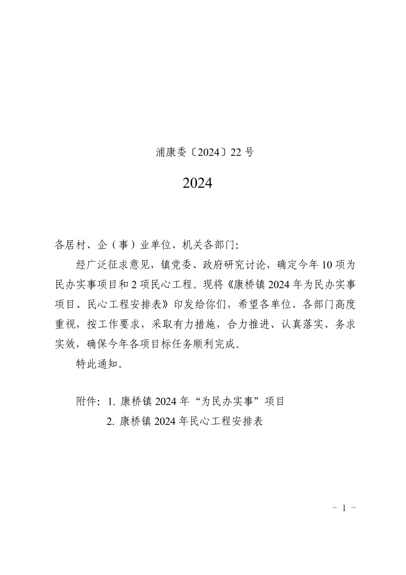 关于印发《康桥镇2024年为民办实事项目、民心工程安排表》的通知