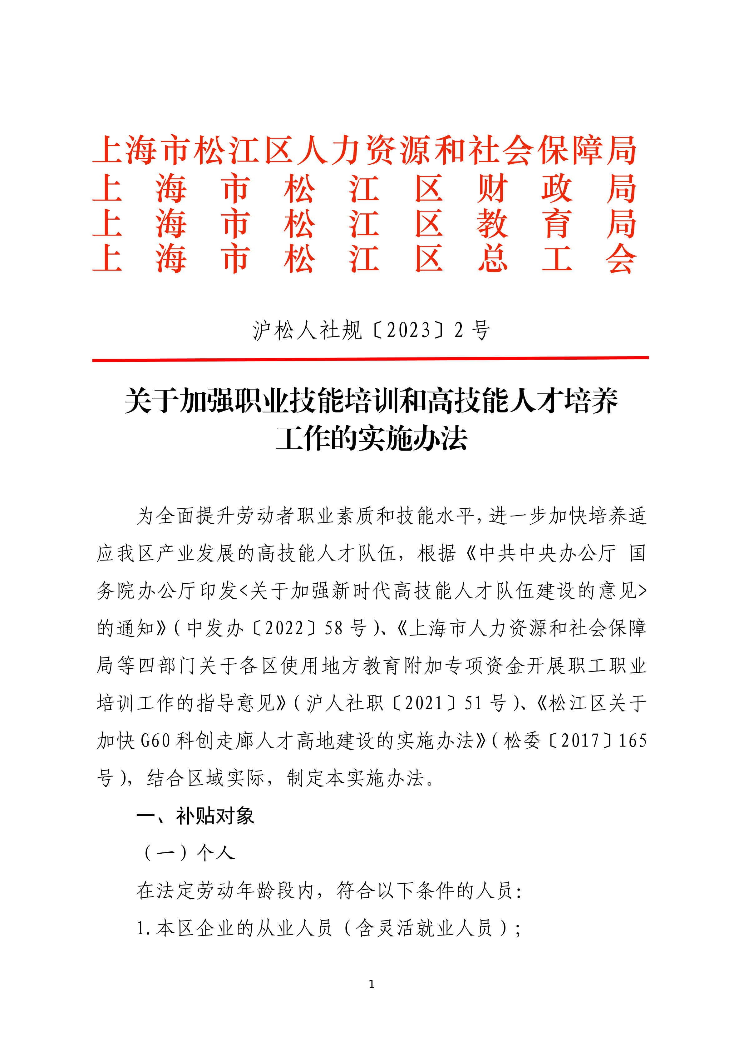 为全面提升劳动者职业素质和技能水平,进一步加快培养适应我区产业发展的高技能人才队伍,根据《中共中央办公厅 国务院办公厅印发<关于加强新时代高技能人才队伍建设的意见>的通知》(中发办〔2022〕58号)、《上海市人力资源和社会保障局等四部门关于各区使用地方教育附加专项资金开展职工职业培训工作的指导意见》(沪人社职〔2021〕51号)、《松江区关于加快G60科创走廊人才高地建设的实施办法》(松委〔2017〕165号),结合区域实际,制定本实施办法。