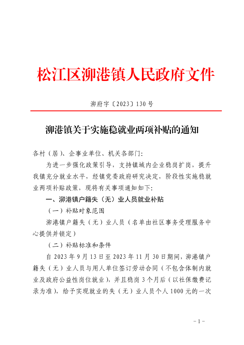 自2023年9月13日至2023年11月30日期间,泖港镇户籍失(无)业人员与用人单位签订劳动合同(不包含体制内就业及政府公益性岗位就业),并且稳岗3个月后(以社保缴费记录为准),给予实现就业的失(无)业人员个人1000元的一次性就业补贴。