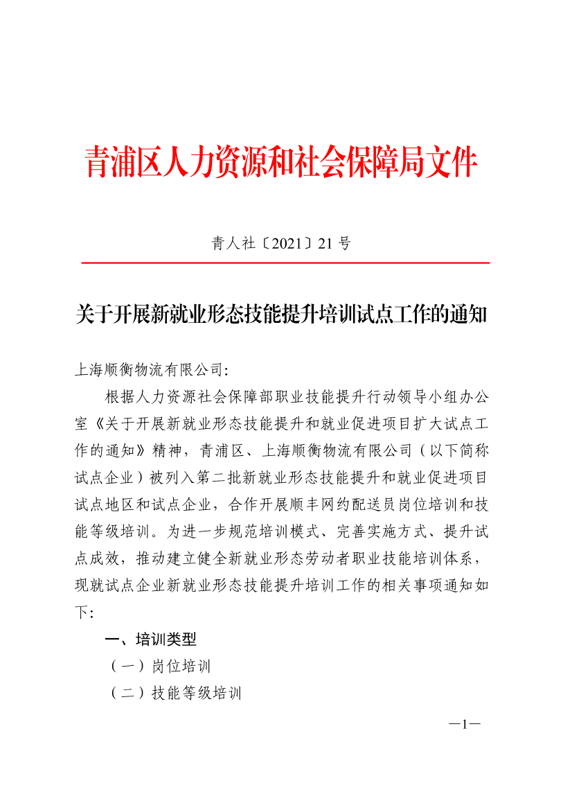 根据人力资源社会保障部职业技能提升行动领导小组办公室《关于开展新就业形态技能提升和就业促进项目扩大试点工作的通知》精神,青浦区、上海顺衡物流有限公司(以下简称试点企业)被列入第二批新就业形态技能提升和就业促进项目试点地区和试点企业,合作开展顺丰网约配送员岗位培训和技能等级培训。为进一步规范培训模式、完善实施方式、提升试点成效,推动建立健全新就业形态劳动者职业技能培训体系,现就试点企业新就业形态技能提升培训工作的相关事项通知如下:
