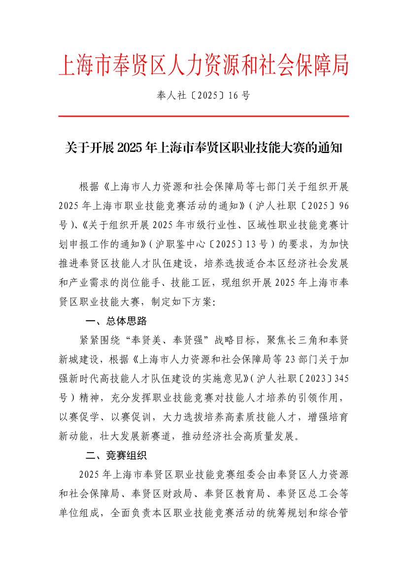 根据《上海市人力资源和社会保障局等七部门关于组织开展2025年上海市职业技能竞赛活动的通知》(沪人社职〔2025〕96号)、《关于组织开展2025年市级行业性、区域性职业技能竞赛计划申报工作的通知》(沪职鉴中心〔2025〕13号)的要求,为加快推进奉贤区技能人才队伍建设,培养选拔适合本区经济社会发展和产业需求的岗位能手、技能工匠,现组织开展2025年上海市奉贤区职业技能大赛,制定如下方案: