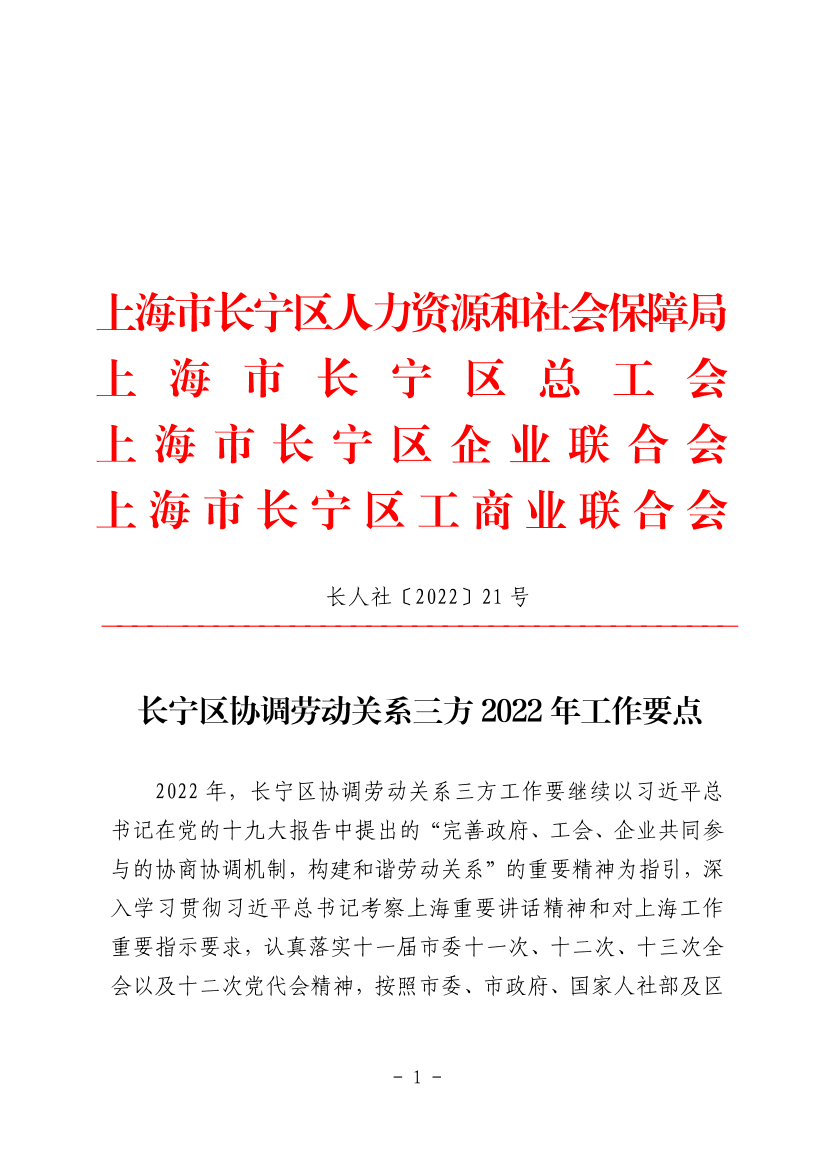 2022年,长宁区协调劳动关系三方工作要继续以习近平总书记在党的十九大报告中提出的“完善政府、工会、企业共同参与的协商协调机制,构建和谐劳动关系”的重要精神为指引,深入学习贯彻习近平总书记考察上海重要讲话精神和对上海工作重要指示要求,认真落实十一届市委十一次、十二次、十三次全会以及十二次党代会精神,按照市委、市政府、国家人社部及区委、区政府的决策部署,坚持稳中求进工作总基调,进一步发挥协商协调机制的优势,着力防范化解劳动关系领域重大风险,切实维护本区劳动关系和谐稳定大局。