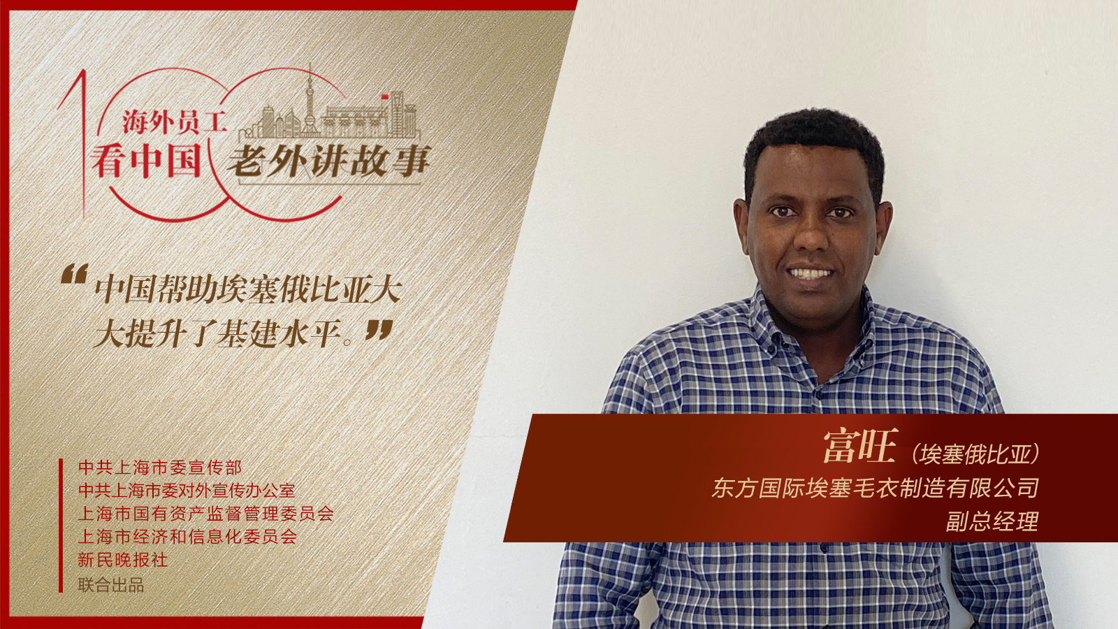从2014年获得中国政府奖学金,被东华大学录取攻读博士学位,到2017年在老师的推荐下,参与上海龙头(集团)股份有限公司在埃塞俄比亚的投资项目,并一路晋升为高管,富旺为自己祖国的纺织服装工业发展贡献着力量,在此过程中,他对中国的情感也随着时光“发酵”,历久弥新。