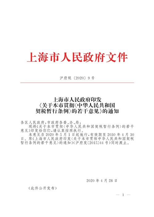本意见自2020年5月1日起施行,有效期至2030年4月30日。原《上海市人民政府印发〈关于本市贯彻中华人民共和国契税暂行条例的若干意见〉的通知》(沪府发〔2015〕44号)同时废止。