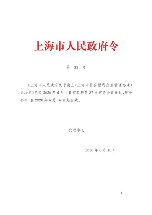 《上海市人民政府关于废止〈上海市社会福利企业管理办法〉的决定》已经2020年6月1日市政府第87次常务会议通过,现予公布,自2020年6月16日起生效。