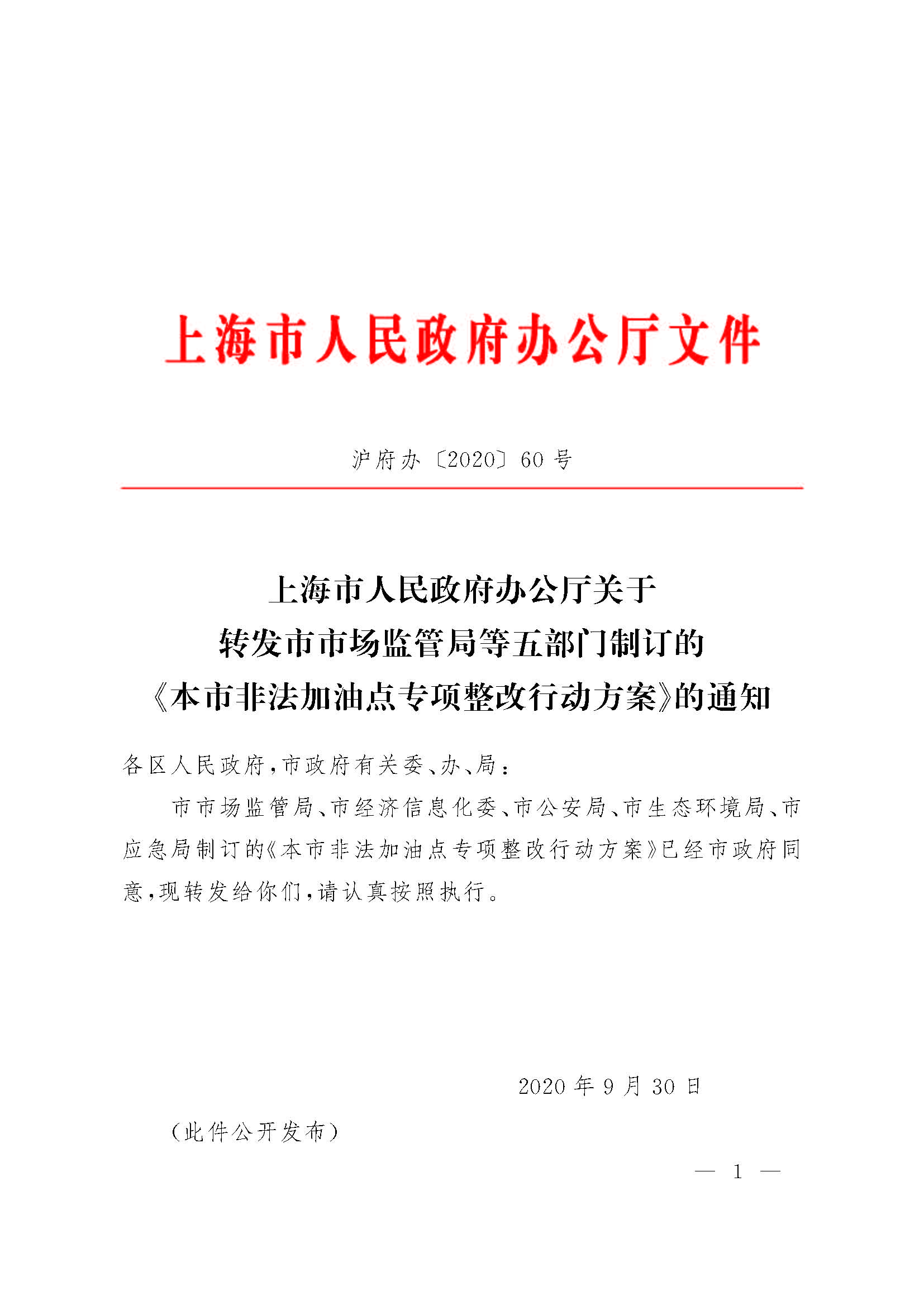 上海市人民政府办公厅关于转发市市场监管局等五部门制订的《本市非法加油点专项整改行动方案》的通知