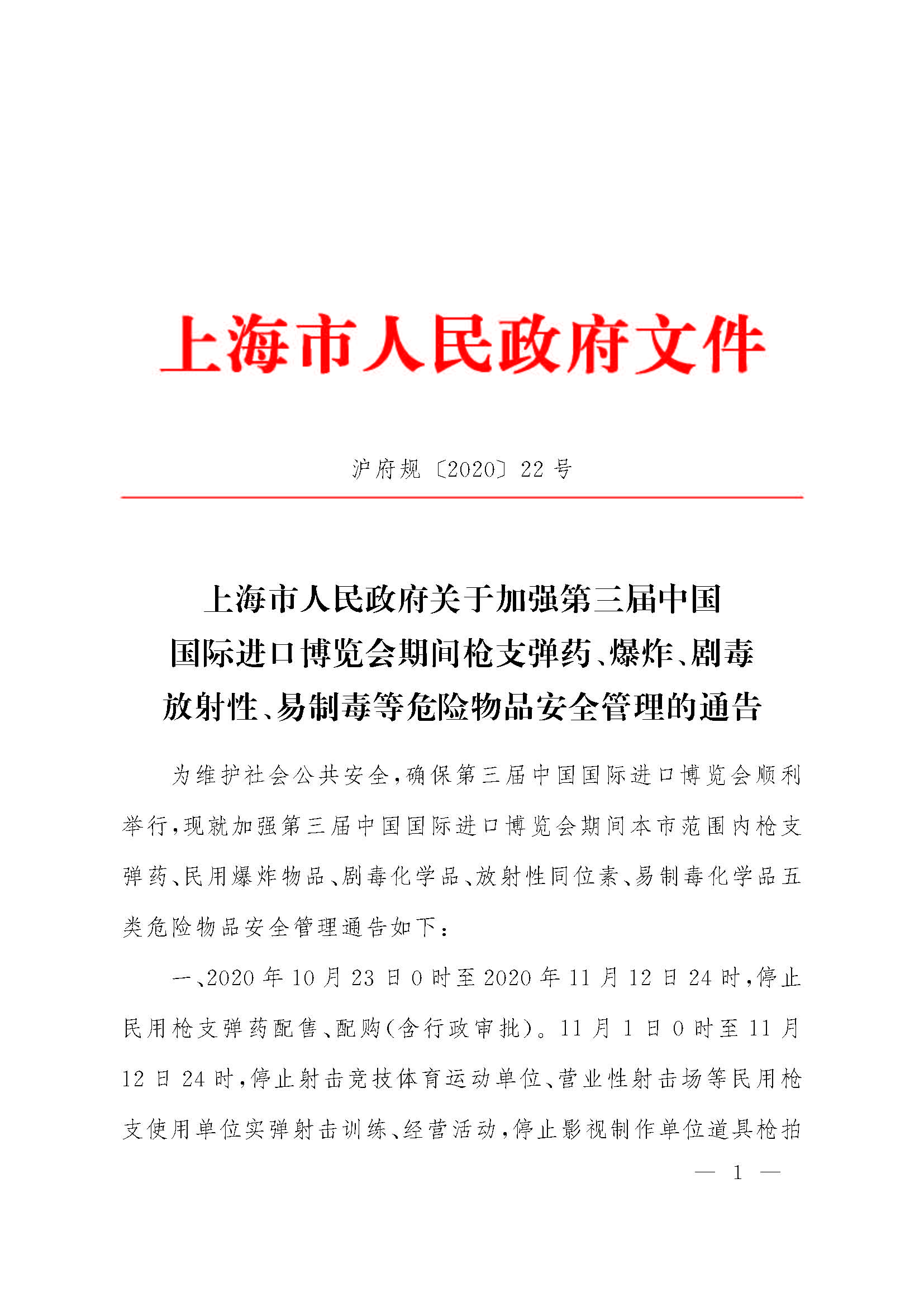 为维护社会公共安全,确保第三届中国国际进口博览会顺利举行,现就加强第三届中国国际进口博览会期间本市范围内枪支弹药、民用爆炸物品、剧毒化学品、放射性同位素、易制毒化学品五类危险物品安全管理通告如下: