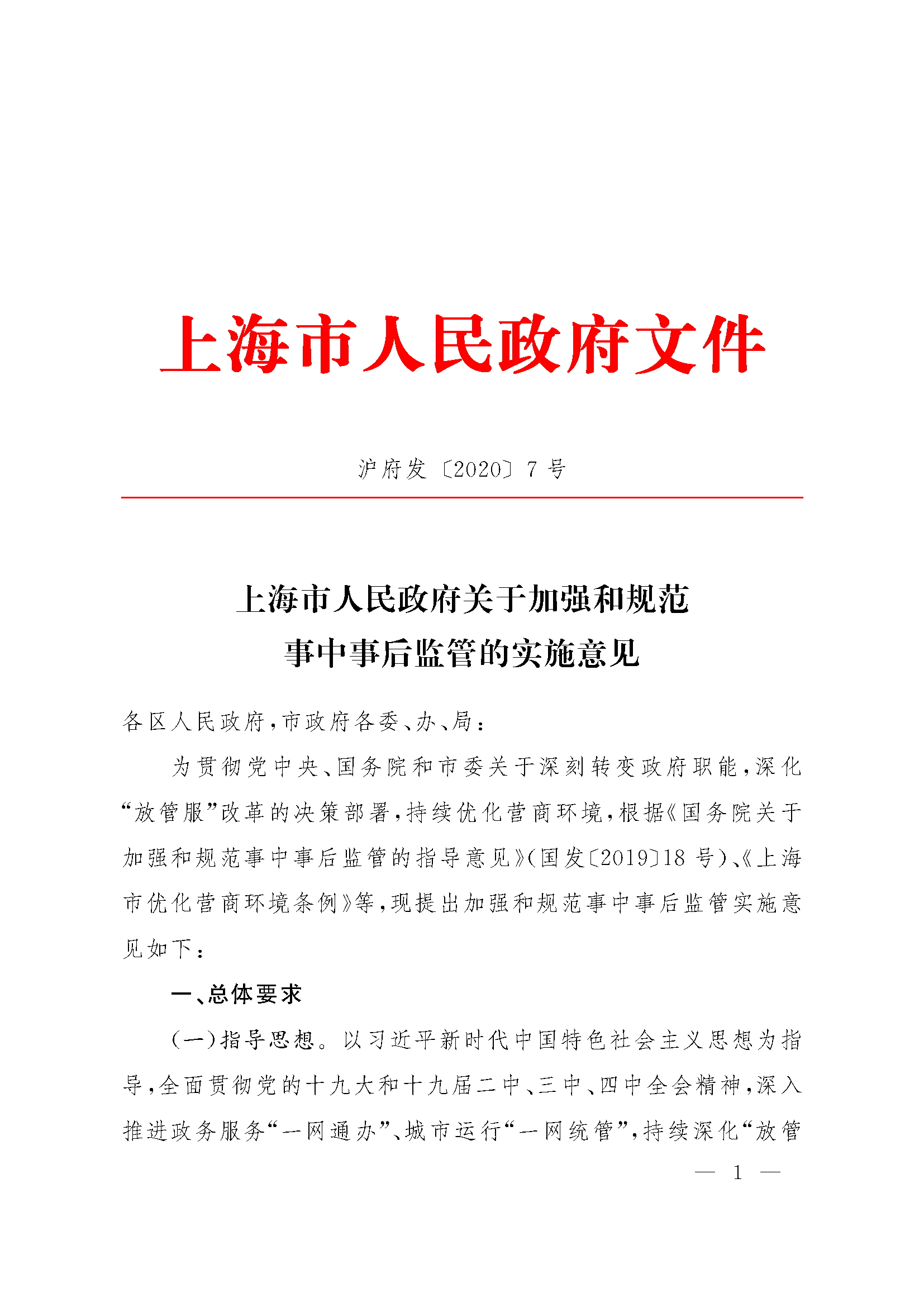 为贯彻党中央、国务院和市委关于深刻转变政府职能,深化“放管服”改革的决策部署,持续优化营商环境,根据《国务院关于加强和规范事中事后监管的指导意见》(国发〔2019〕18号)、《上海市优化营商环境条例》等,现提出加强和规范事中事后监管实施意见如下: