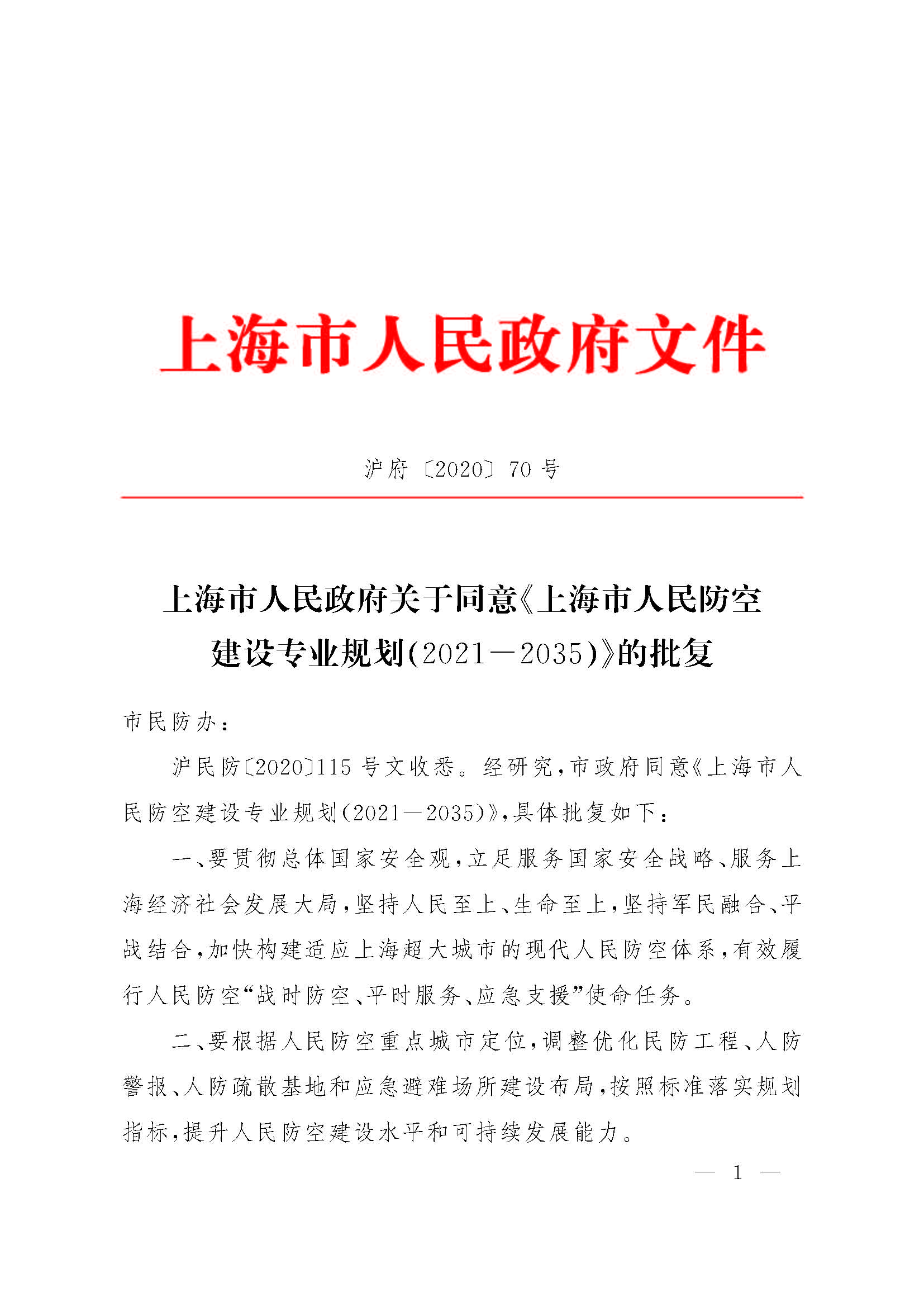 沪民防〔2020〕115号文收悉。经研究,市政府同意《上海市人民防空建设专业规划(2021-2035)》,具体批复如下: