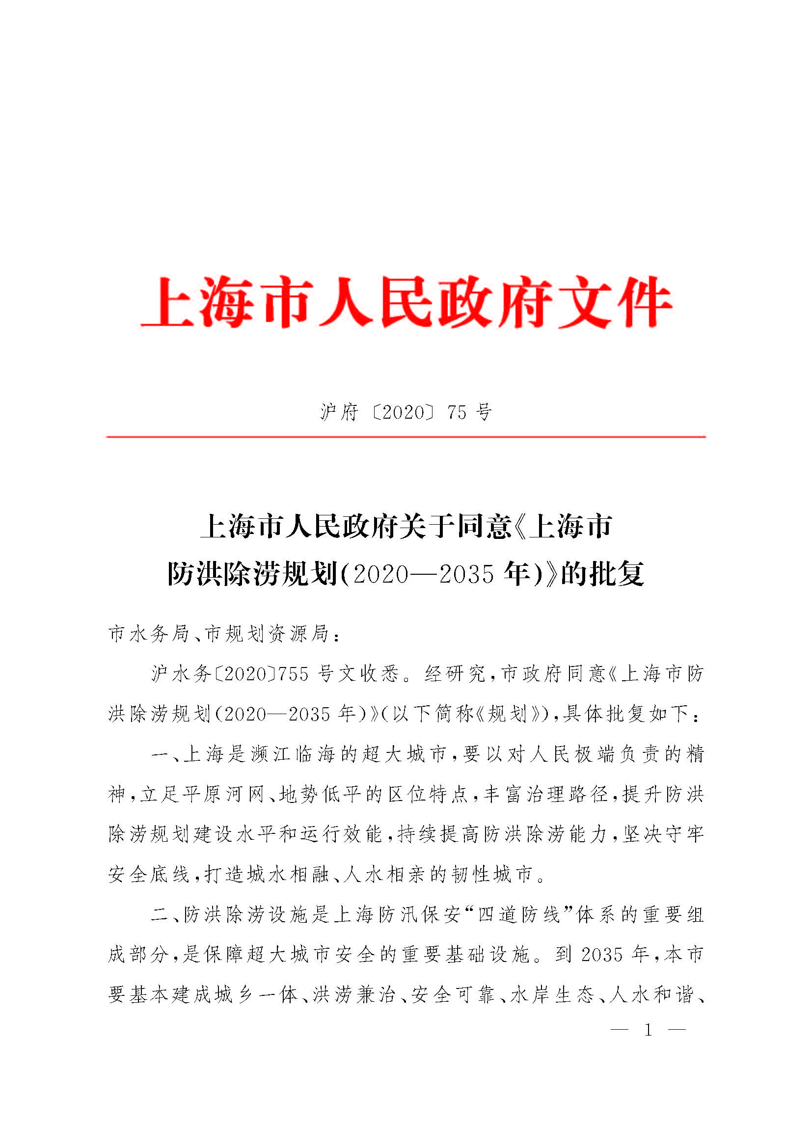 沪水务〔2020〕755号文收悉。经研究,市政府同意《上海市防洪除涝规划(2020—2035年)》(以下简称《规划》),具体批复如下: