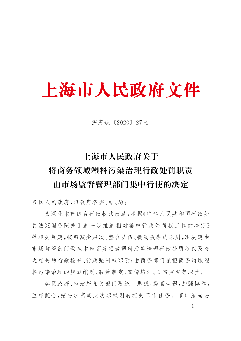 为深化本市综合行政执法改革,根据《中华人民共和国行政处罚法》《国务院关于进一步推进相对集中行政处罚权工作的决定》等相关规定,按照减少层次、整合队伍、提高效率的原则,现决定由市场监管部门承担本市商务领域塑料污染治理行政处罚权以及与之相关的行政检查、行政强制权职责;由商务部门承担商务领域塑料污染治理的规划编制、政策制定、宣传培训、日常监督等职责。