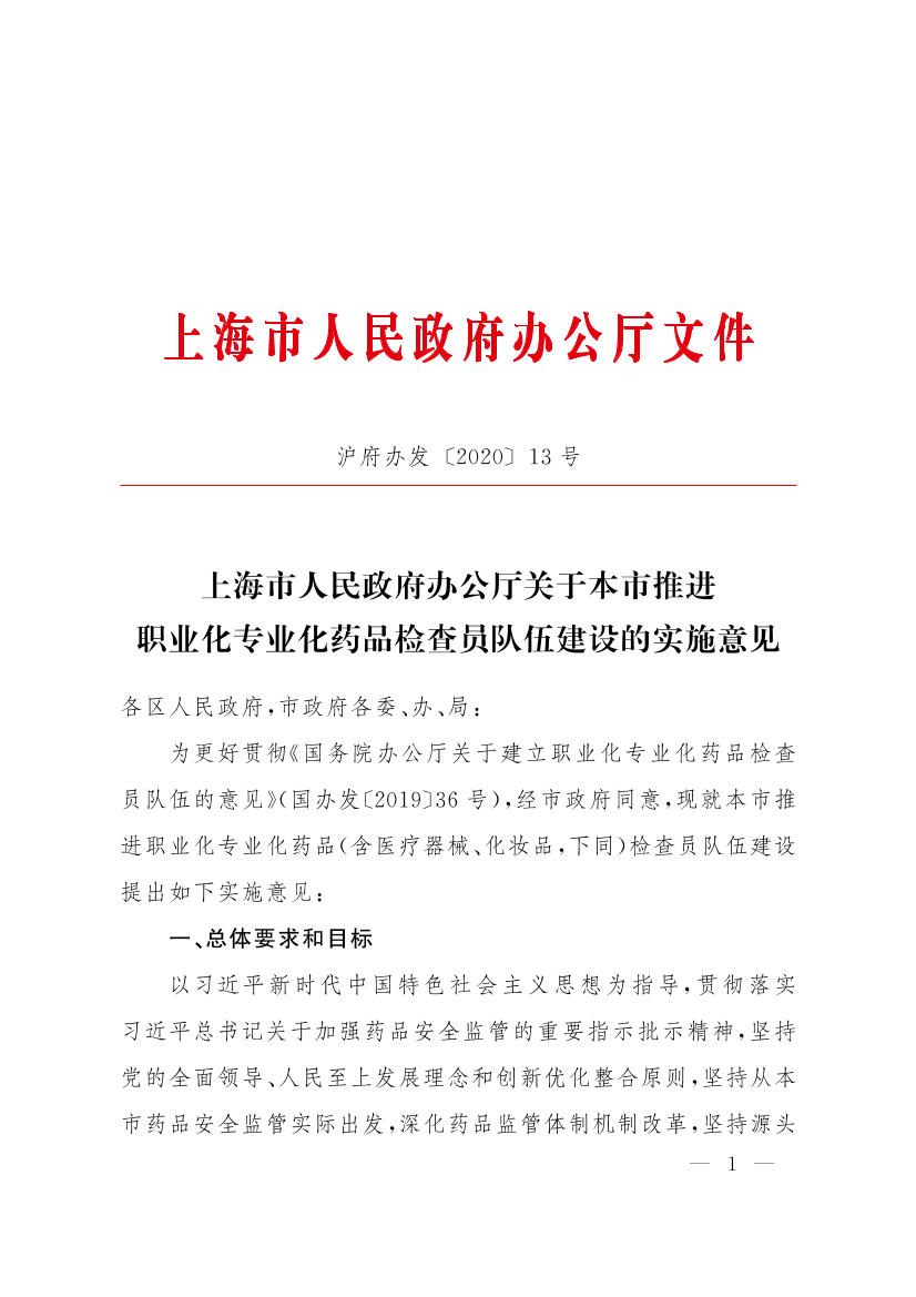 为更好贯彻《国务院办公厅关于建立职业化专业化药品检查员队伍的意见》(国办发〔2019〕36号),经市政府同意,现就本市推进职业化专业化药品(含医疗器械、化妆品,下同)检查员队伍建设提出如下实施意见: