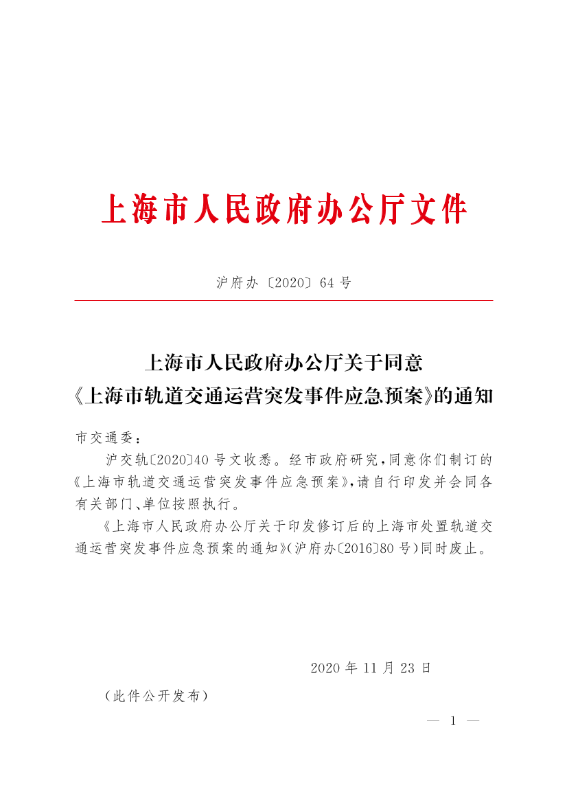 《上海市人民政府办公厅关于印发修订后的上海市处置轨道交通运营突发事件应急预案的通知》(沪府办〔2016〕80号)同时废止。