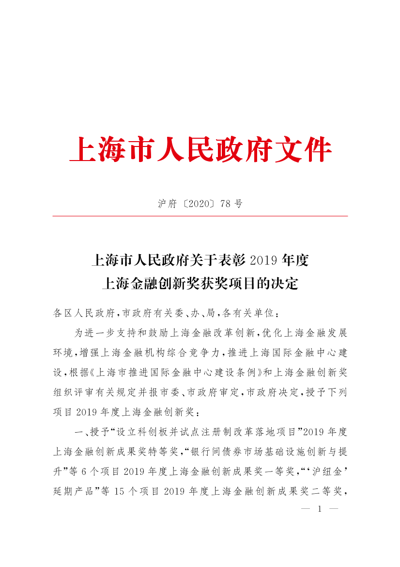 为进一步支持和鼓励上海金融改革创新,优化上海金融发展环境,增强上海金融机构综合竞争力,推进上海国际金融中心建设,根据《上海市推进国际金融中心建设条例》和上海金融创新奖组织评审有关规定并报市委、市政府审定,市政府决定,授予下列项目2019年度上海金融创新奖: