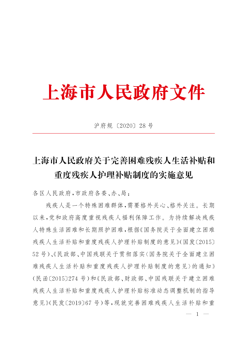上海市人民政府关于完善困难残疾人生活补贴和重度残疾人护理补贴制度的实施意见