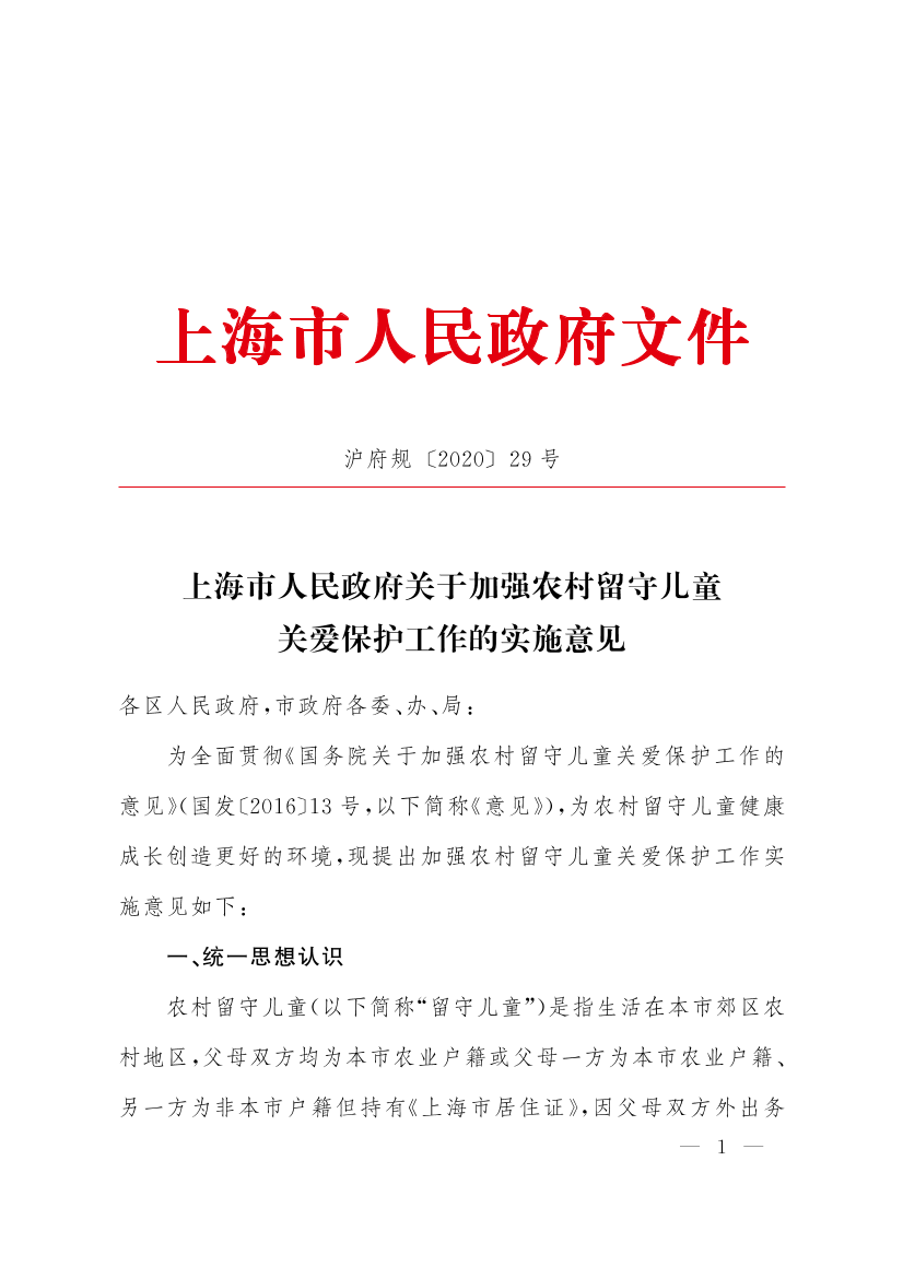 农村留守儿童(以下简称“留守儿童”)是指生活在本市郊区农村地区,父母双方均为本市农业户籍或父母一方为本市农业户籍、另一方为非本市户籍但持有《上海市居住证》,因父母双方外出务工或一方外出务工,另一方无监护能力,不满16周岁的本市户籍未成年人。留守儿童是本市儿童群体的重要组成部分。加强留守儿童关爱保护工作,是各级政府的重要职责,也是家庭和社会的共同责任。各区、各有关部门要充分认识加强留守儿童关爱保护工作的重要性,增强责任感和使命感,采取有效措施,确保留守儿童得到妥善监护照料和更好的关爱保护。