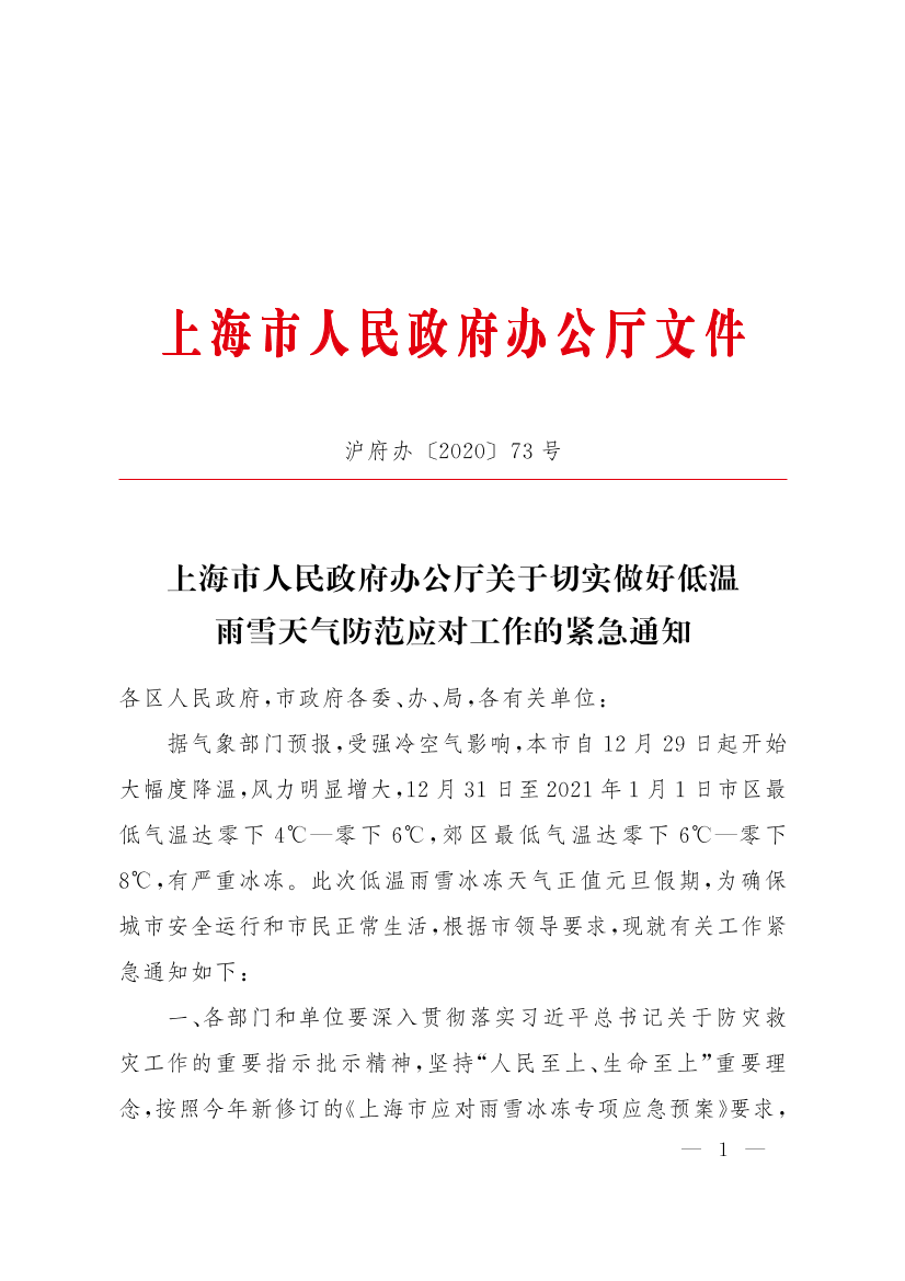 据气象部门预报,受强冷空气影响,本市自12月29日起开始大幅度降温,风力明显增大,12月31日至2021年1月1日市区最低气温达零下4℃—零下6℃,郊区最低气温达零下6℃—零下8℃,有严重冰冻。此次低温雨雪冰冻天气正值元旦假期,为确保城市安全运行和市民正常生活,根据市领导要求,现就有关工作紧急通知如下: