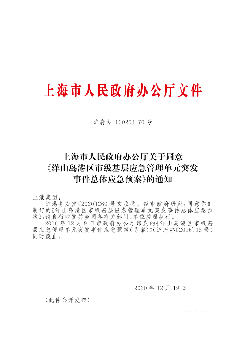 沪港务安发〔2020〕260号文收悉。经市政府研究,同意你们制订的《洋山岛港区市级基层应急管理单元突发事件总体应急预案》,请自行印发并会同各有关部门、单位按照执行。
