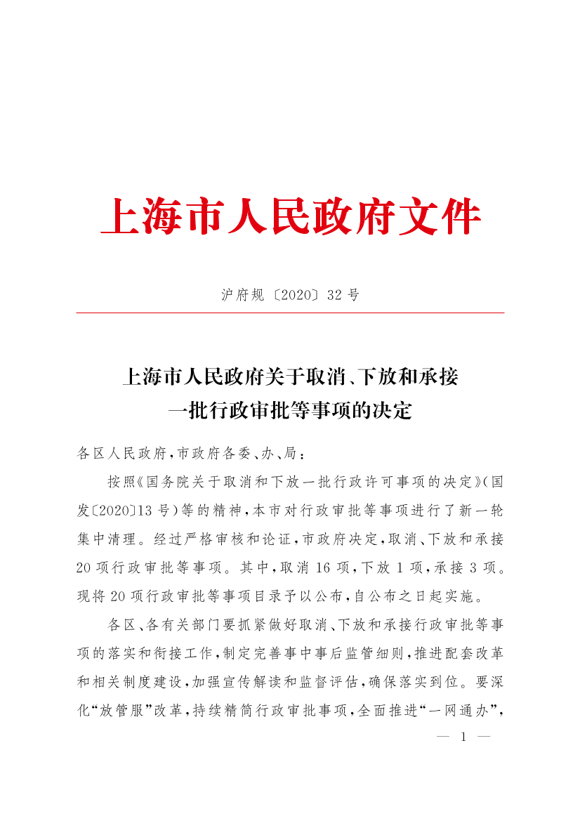 按照《国务院关于取消和下放一批行政许可事项的决定》(国发〔2020〕13号)等的精神,本市对行政审批等事项进行了新一轮集中清理。经过严格审核和论证,市政府决定,取消、下放和承接20项行政审批等事项。其中,取消16项,下放1项,承接3项。现将20项行政审批等事项目录予以公布,自公布之日起实施。