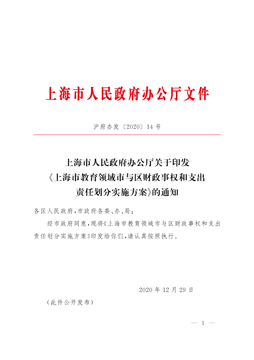 上海市人民政府办公厅关于印发《上海市教育领域市与区财政事权和支出责任划分实施方案》的通知
