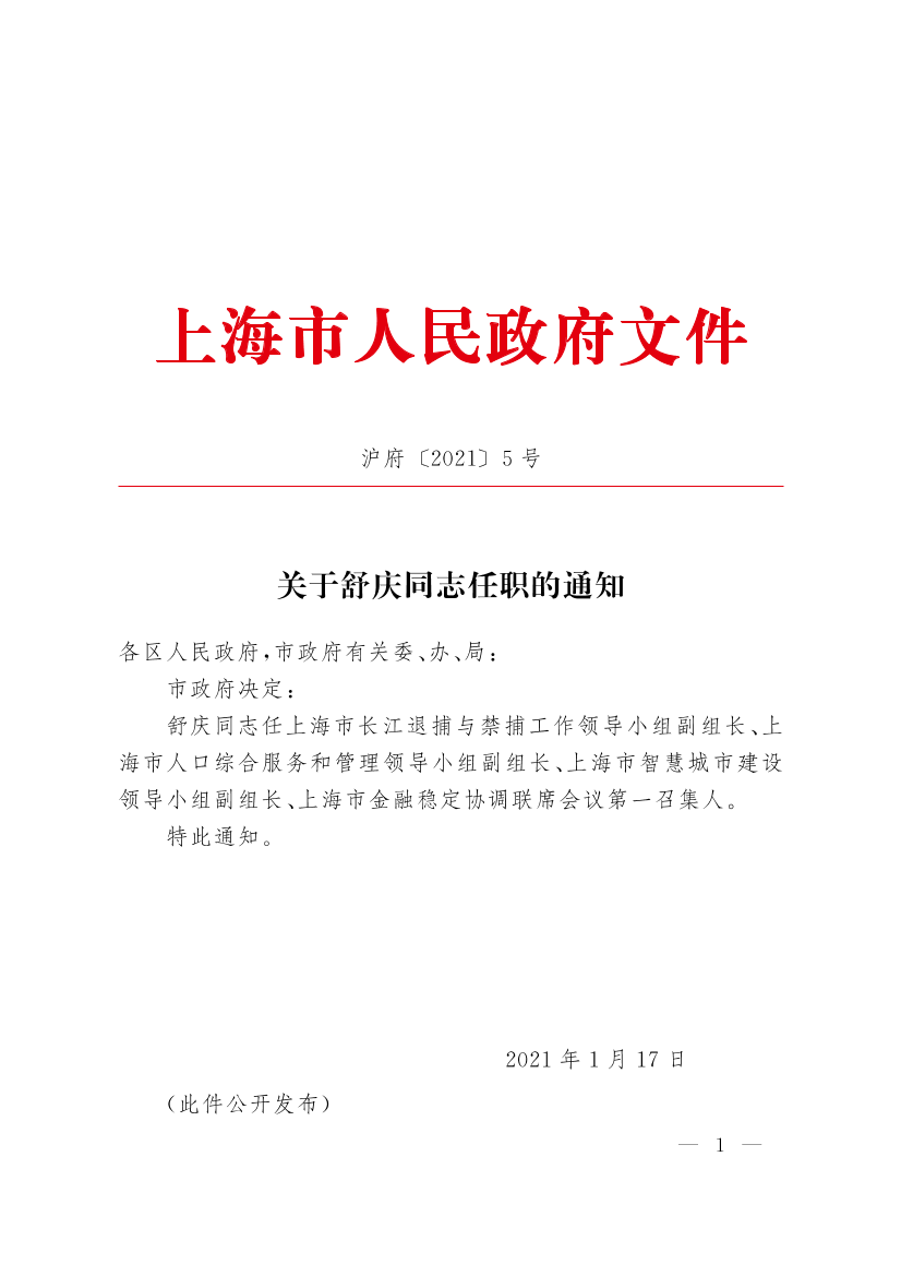 舒庆同志任上海市长江退捕与禁捕工作领导小组副组长、上海市人口综合服务和管理领导小组副组长、上海市智慧城市建设领导小组副组长、上海市金融稳定协调联席会议第一召集人。