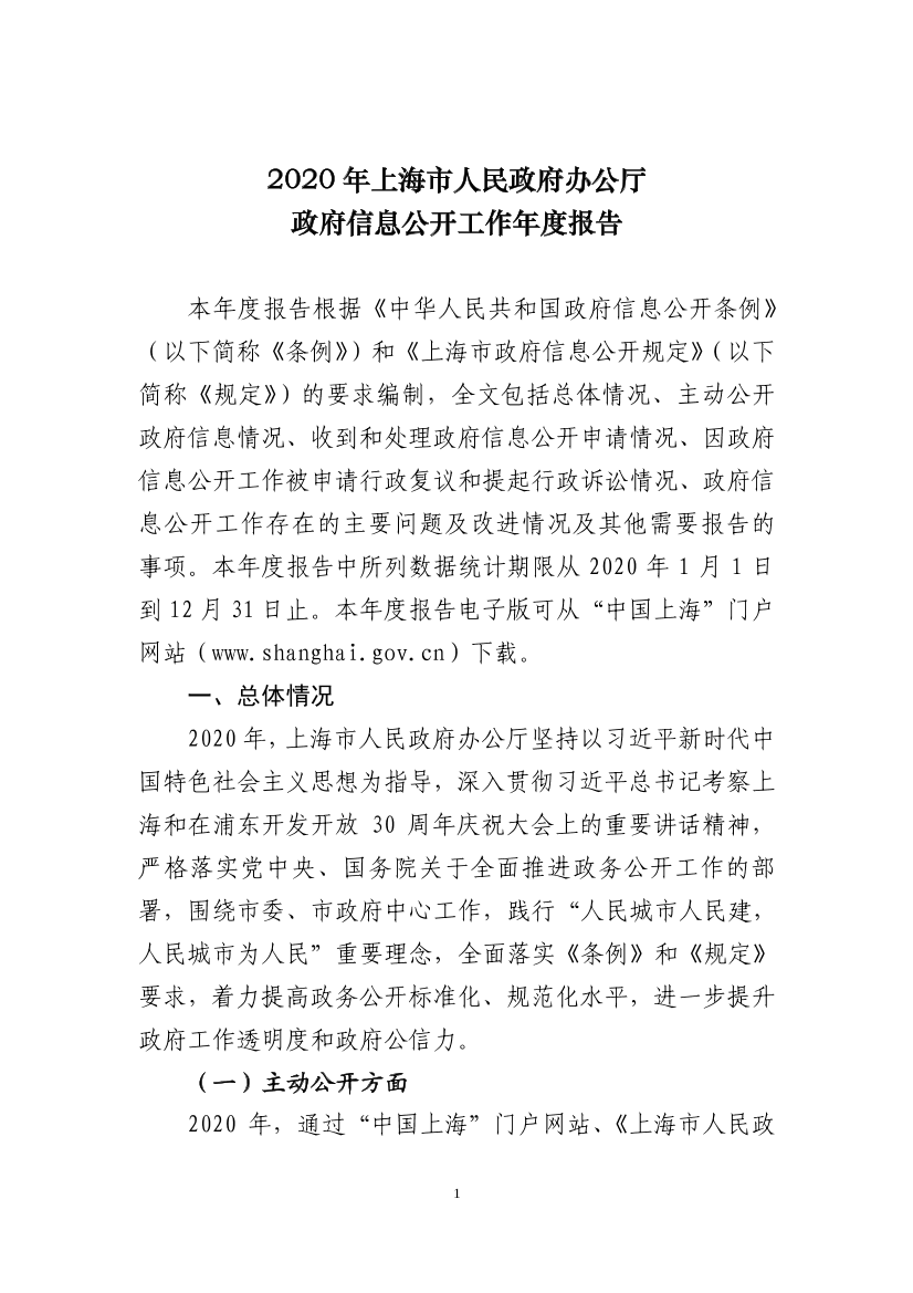 本年度报告根据《中华人民共和国政府信息公开条例》(以下简称《条例》)和《上海市政府信息公开规定》(以下简称《规定》)的要求编制,全文包括总体情况、主动公开政府信息情况、收到和处理政府信息公开申请情况、因政府信息公开工作被申请行政复议和提起行政诉讼情况、政府信息公开工作存在的主要问题及改进情况及其他需要报告的事项。本年度报告中所列数据统计期限从2020年1月1日到12月31日止。本年度报告电子版可从“中国上海”门户网站(www.shanghai.gov.cn)下载。