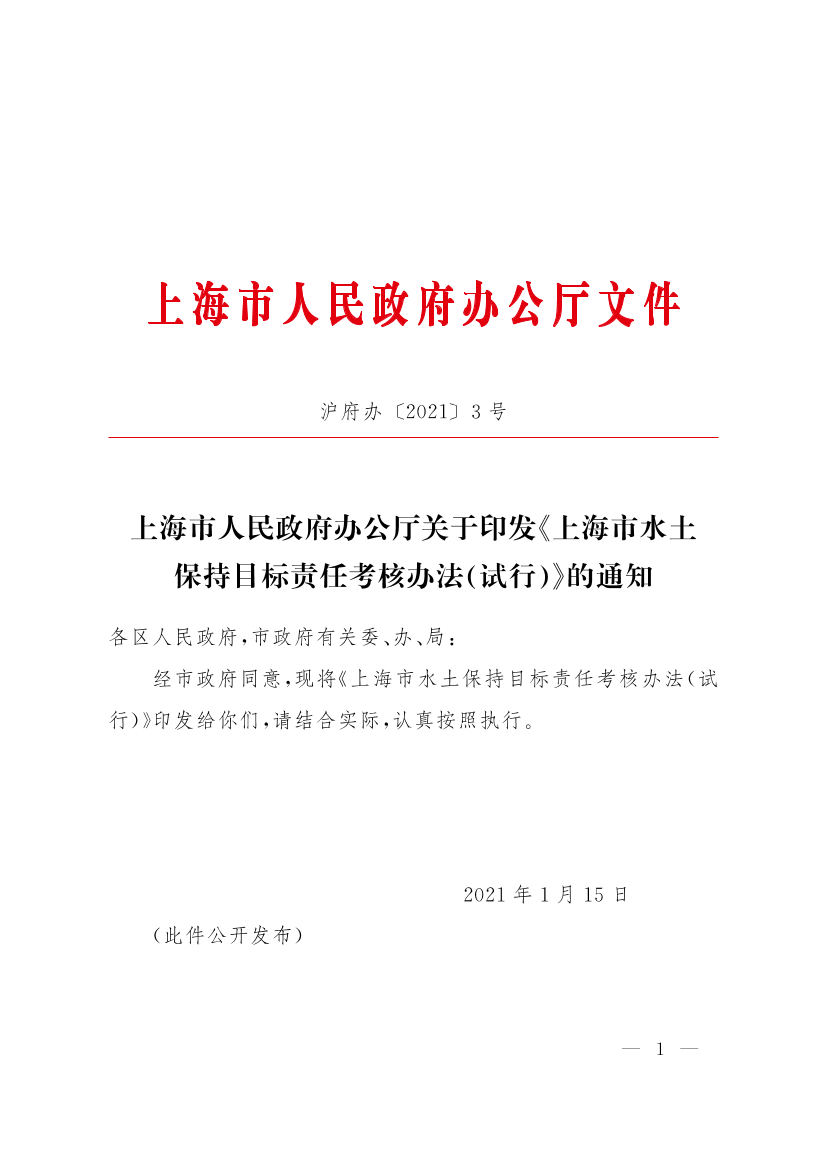 上海市人民政府办公厅关于印发《上海市水土保持目标责任考核办法(试行)》的通知