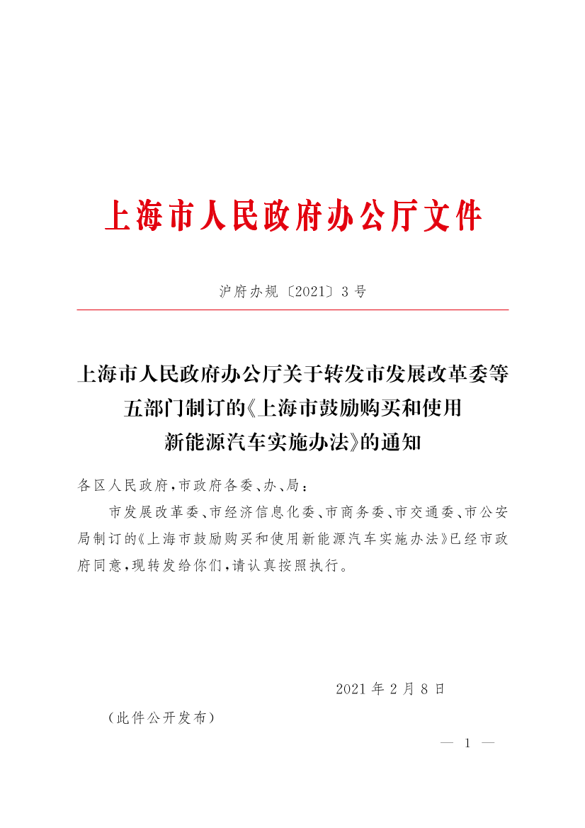 上海市人民政府办公厅关于转发市发展改革委等五部门制订的《上海市鼓励购买和使用新能源汽车实施办法》的通知