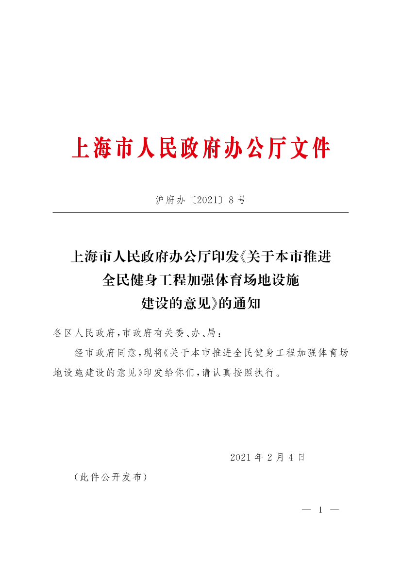 上海市人民政府办公厅印发《关于本市推进全民健身工程加强体育场地设施建设的意见》的通知