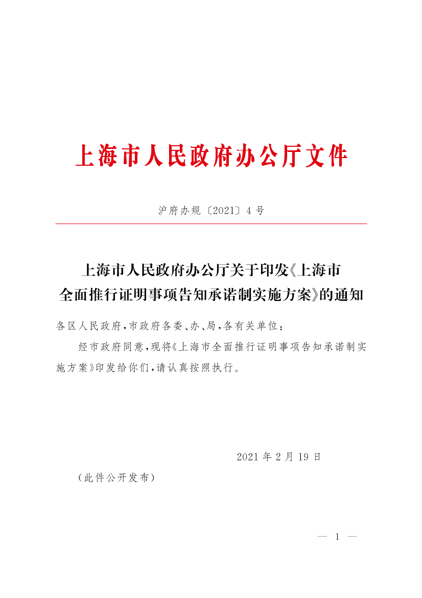 上海市人民政府办公厅关于印发《上海市全面推行证明事项告知承诺制实施方案》的通知
