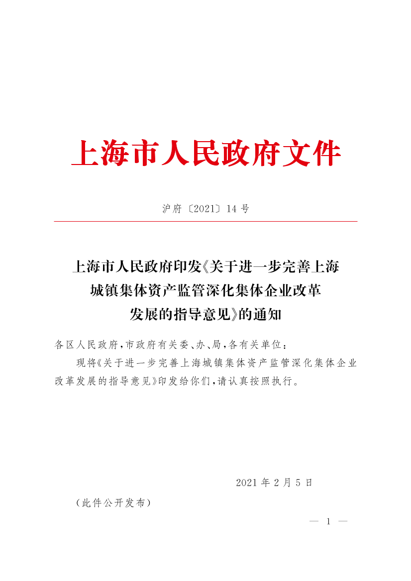 上海市人民政府印发《关于进一步完善上海城镇集体资产监管深化集体企业改革发展的指导意见》的通知