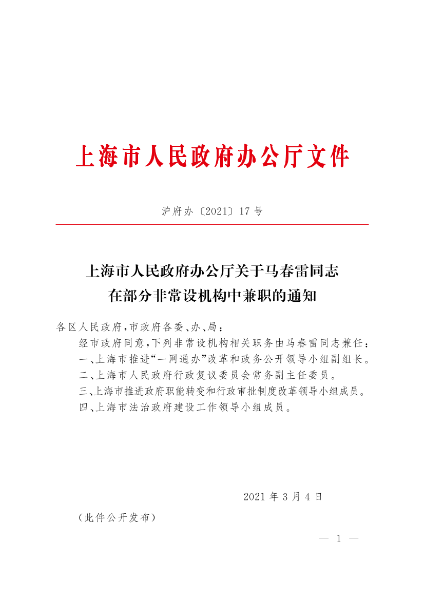 上海市人民政府办公厅关于马春雷同志在部分非常设机构中兼职的通知