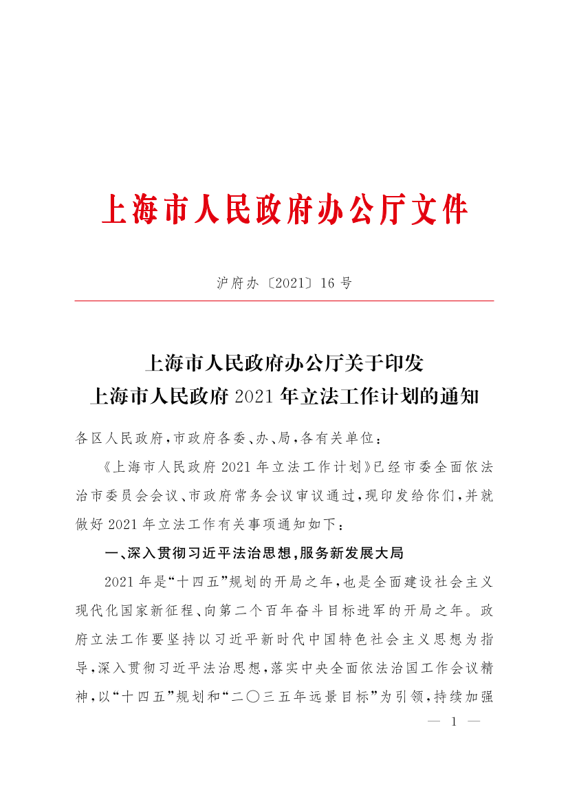 上海市人民政府办公厅关于印发上海市人民政府2021年立法工作计划的通知